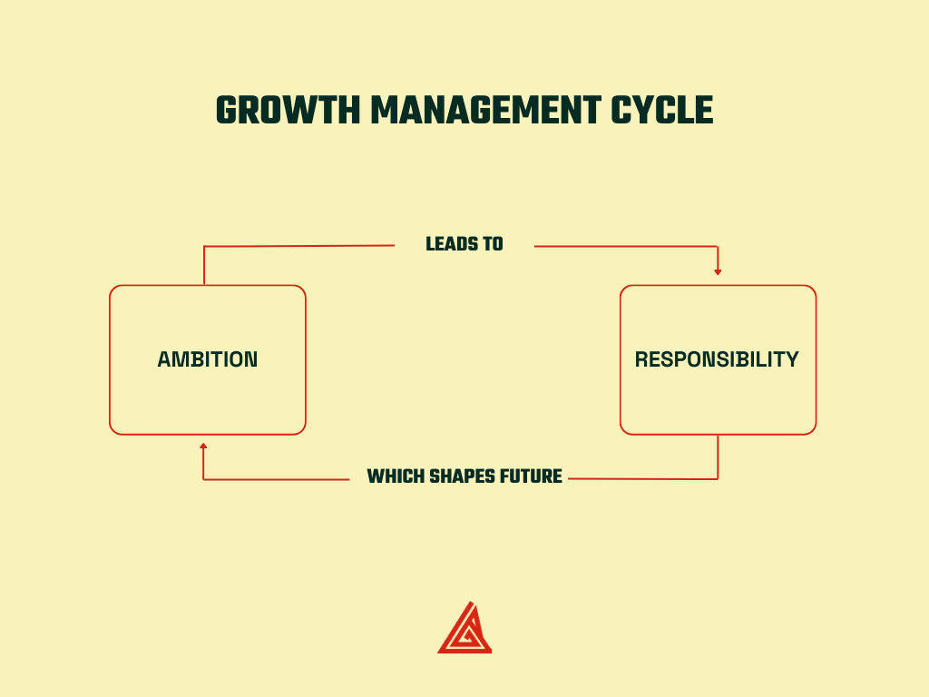 Ambition leads to responsibility which shapes future ambition. Each stage of growth adds complexity while previous responsibilities continue. The intensity of responsibility changes throughout the journey. In the early stages of growth, ambition and responsibility are simple in scope because of experience. In later stages of growth, ambition and responsibility are more complex because of experience and scope of activities.